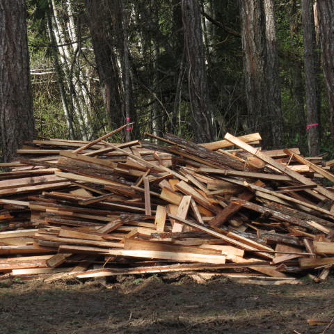 I started with a rough plan and then sort of made it up as I went along. The walls are five inches of light clay straw or ‘slip straw’ – clay blended with water to form a light slip that is tossed salad-style with straw and then packed between plywood forms. Karen and I spent a few days making mud and mixing a stuffing. In a few months we’ll natural plaster the building. The Douglas fir rafters and roof planks came out of our huge pile of site-cut lumber.
