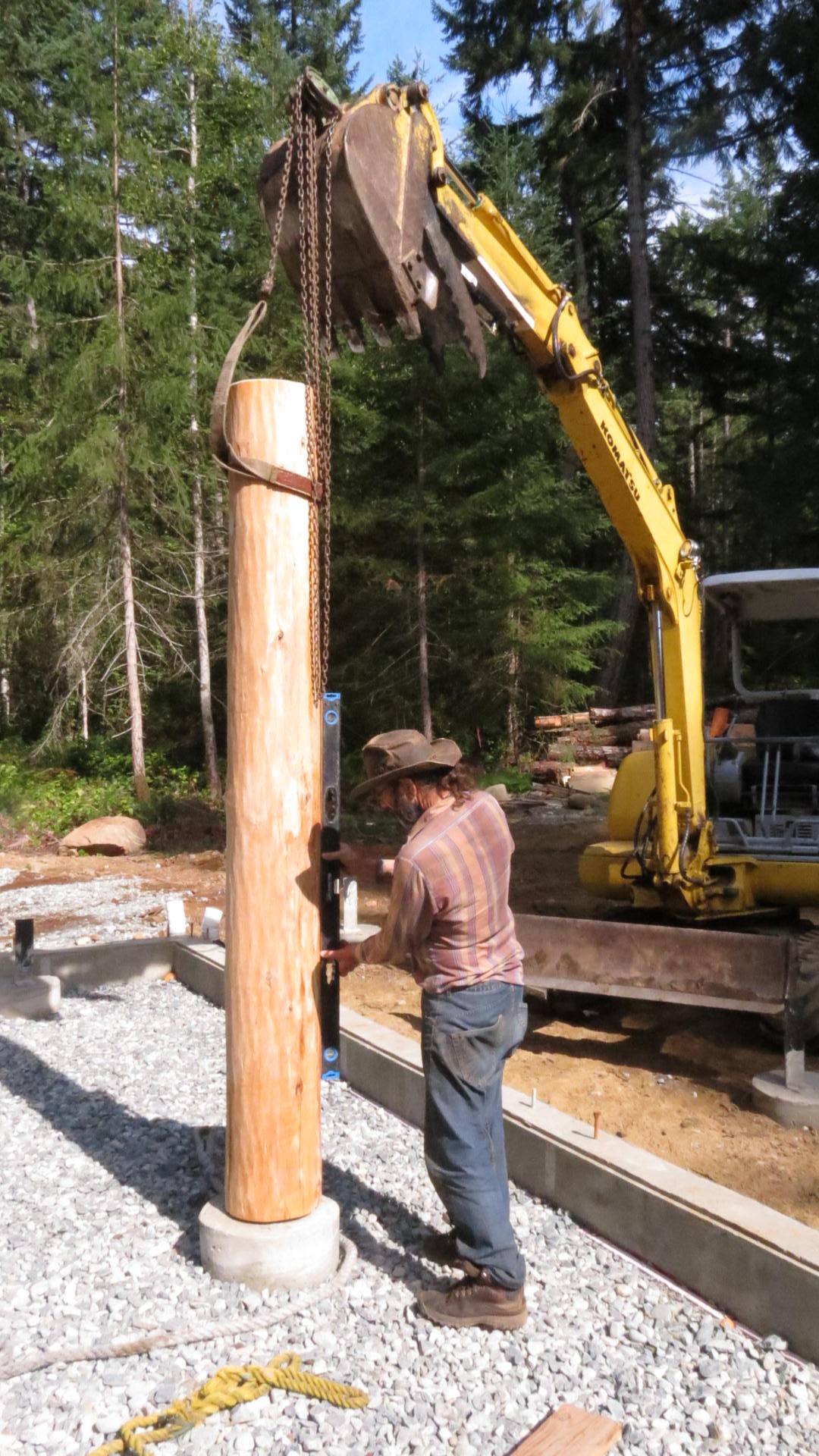 As well as teaching Karen how to grow organic food at scale, producing probably the best tomatoes on Gabriola and being one of the most generous people imaginable, our radical farmer neighbour John also happens to have a small excavator. When he offered to lend it to us – a giddy man driving an excavator onto your land should never be refused – I released the slaves from my Iron Age building project and violà, the first post was erected.